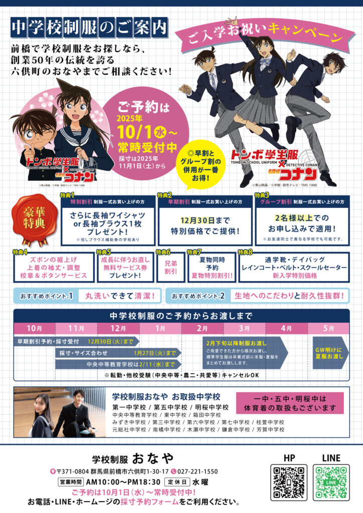 これからも学校制服おなやは、「信頼の品質」と「心のこもったサービス」を胸に、前橋市六供町から未来を担う生徒の皆さまの門出を誠心誠意サポートいたします。