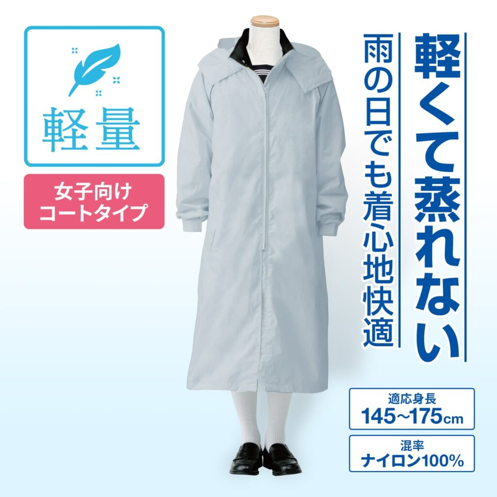 自転車通学の必需品。カバンを背負ったまま着用できる、とっても軽い高機能レインウェアです。